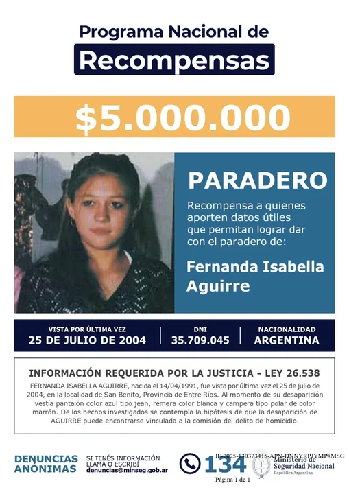 El Ministerio de Seguridad Nacional actualizó a cinco millones de pesos la recompensa ofrecida por información que permita dar con el paradero de Fernanda Isabella Aguirre, la joven desaparecida en la ciudad de Paraná, provincia de Entre Ríos, desde julio de 2004.