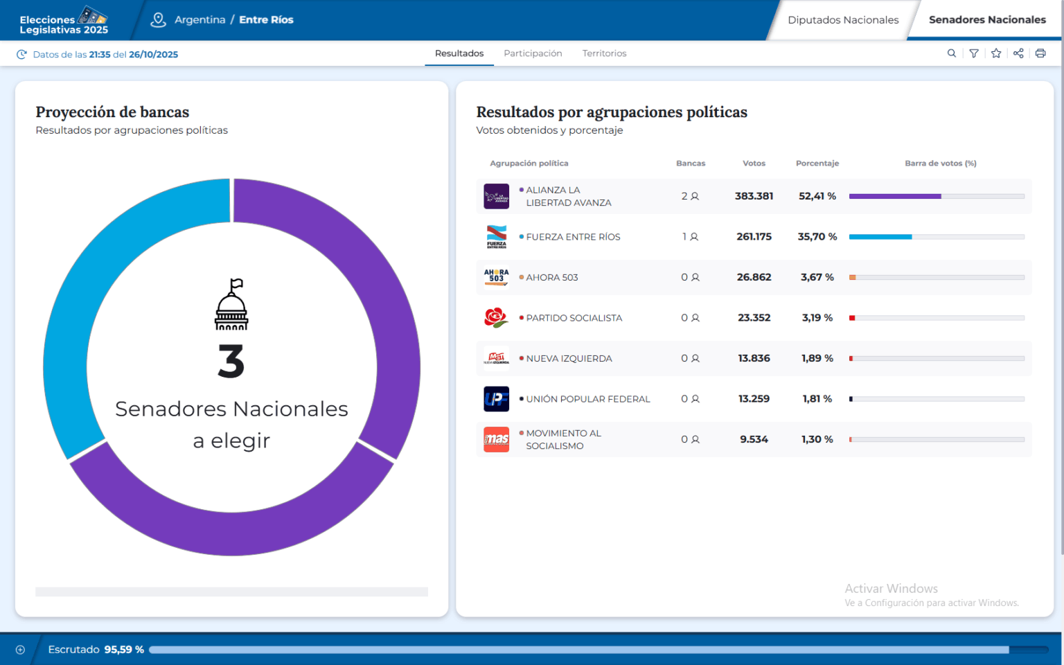 La alianza entre Milei y Frigerio se impuso por un amplio margen. Le sacó 19 puntos para el Senado y casi 17 para Diputados. Salvo Feliciano, Federal e Islas, la provincia se pintó de violeta. El oficialismo se impuso en Concordia por 10 puntos y en Paraná por 15. El voto en blanco salió tercero.