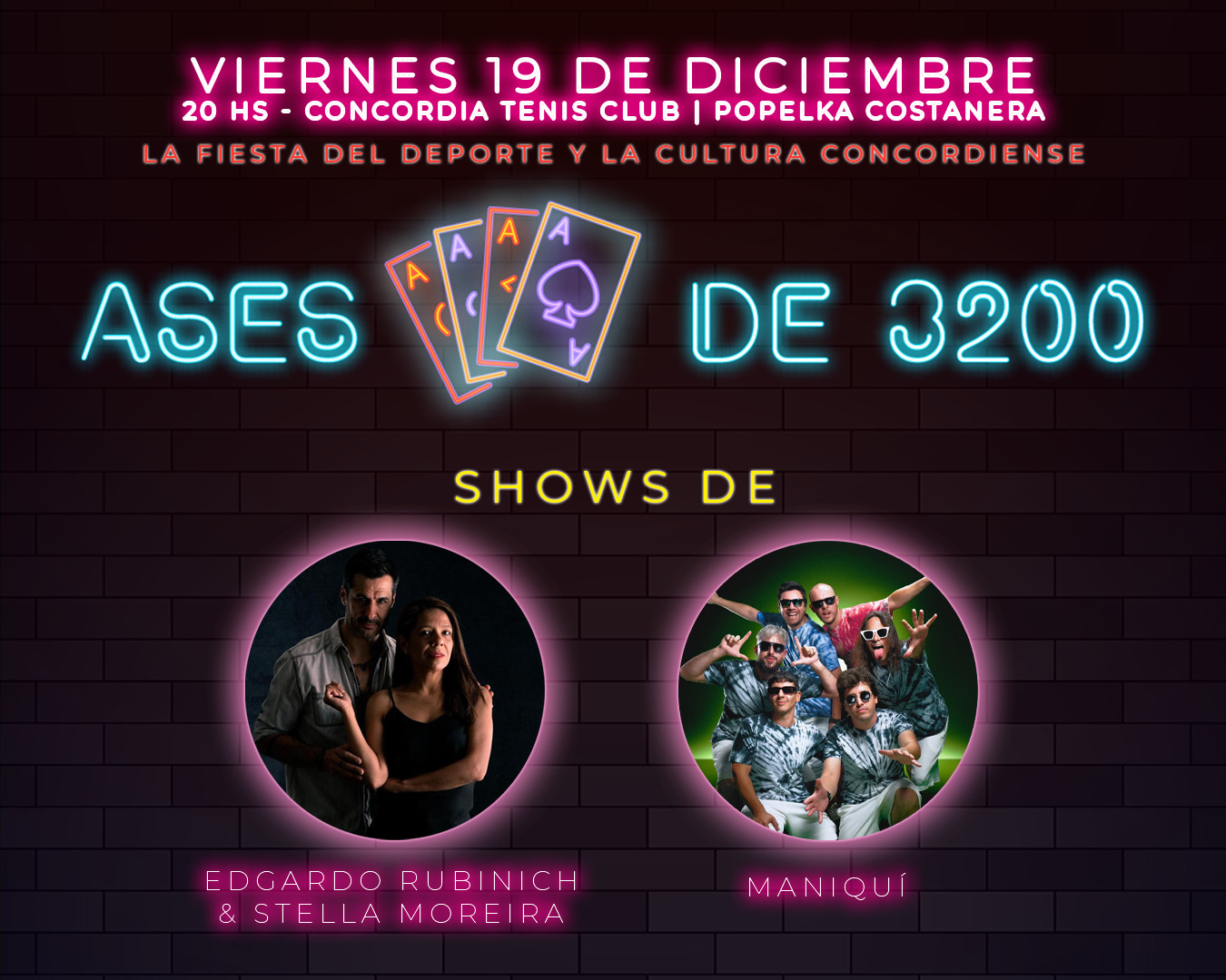 Este 19 de diciembre, además de la entrega de reconocimientos a los deportistas más destacados del año, que incluiré el reconocimiento individual y a clubes e instituciones deportivos, como también por segunda vez la entrega del “As de Concordia” (distinción que llega por el voto de los mismos deportistas), habrá música en vivo con las presentaciones de Edgardo Rubinich & Stella Moreira y el cierre con Maniquí.