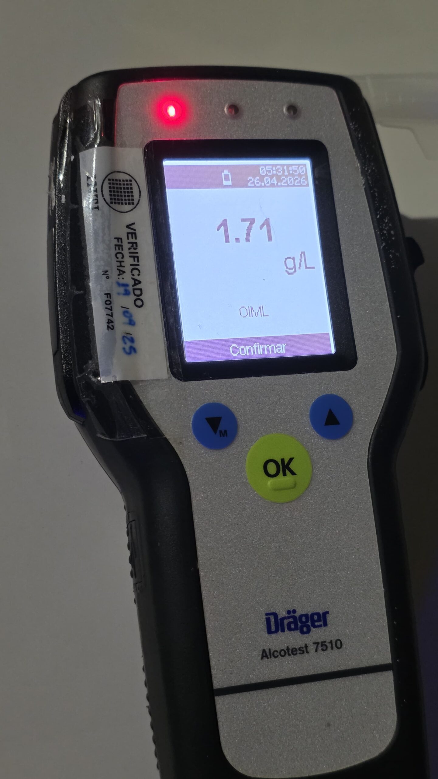 Tras el procedimiento, se dio intervención a personal de la Dirección de Tránsito, que practicó el test de alcoholemia al conductor, arrojando resultado positivo de 1,71 gramos de alcohol por litro de sangre.