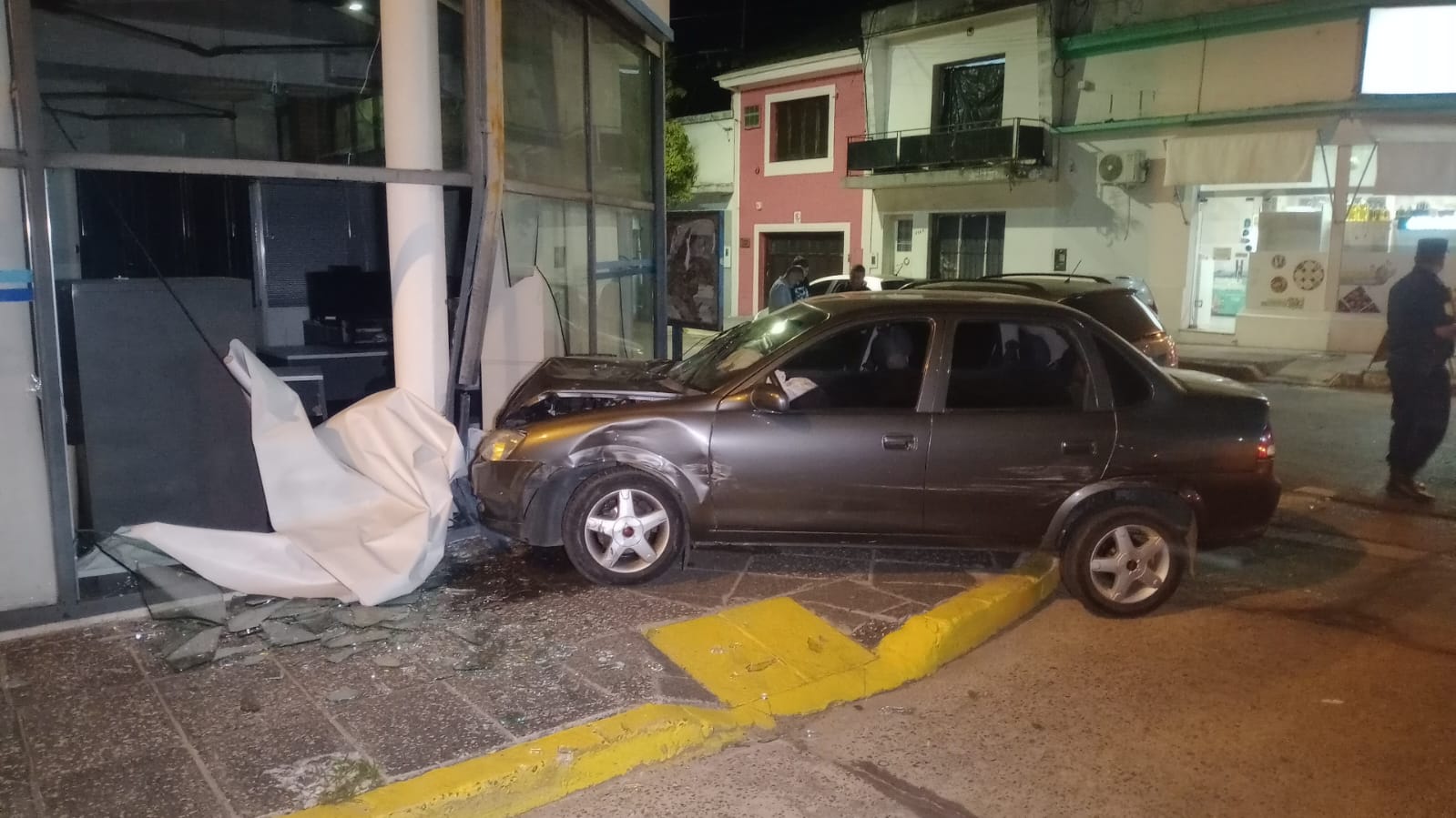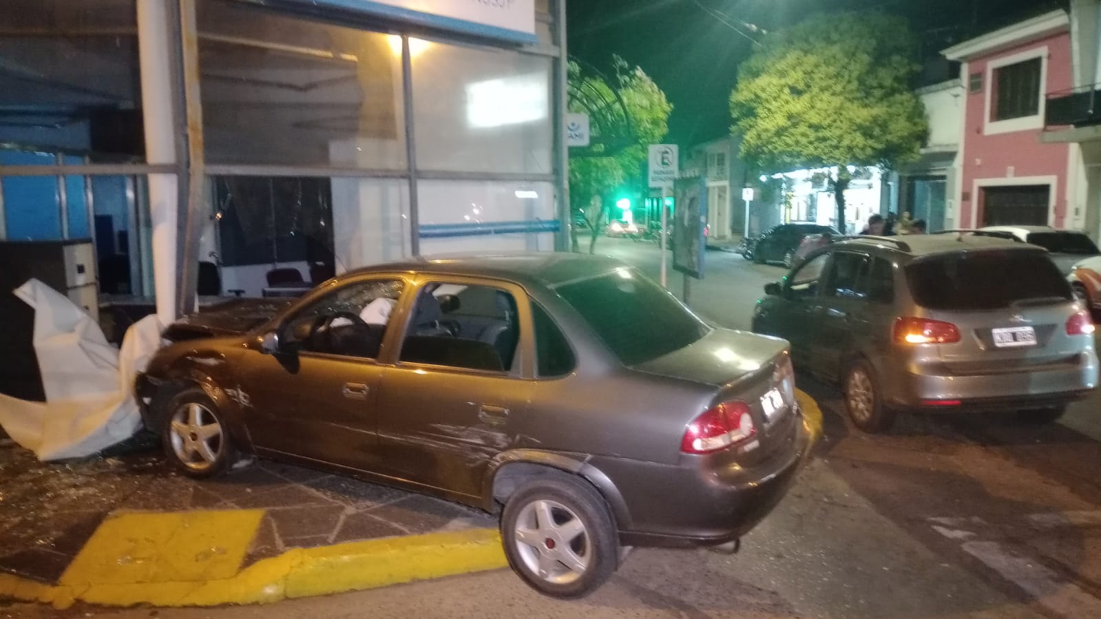 Debido al fuerte impacto, el Corsa terminó incrustado contra la fachada del edificio de PAMI, provocando daños materiales de consideración.