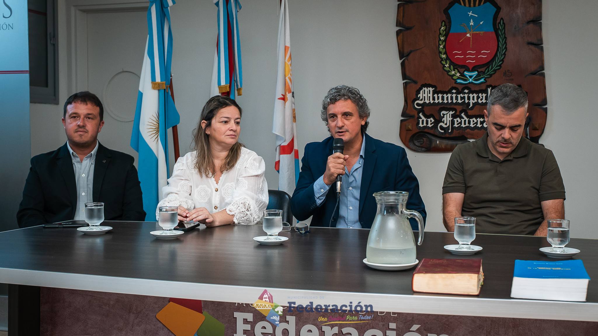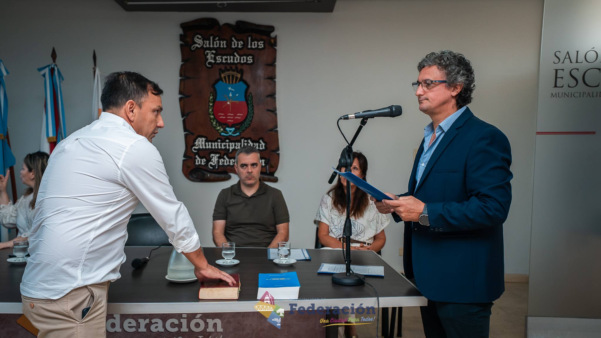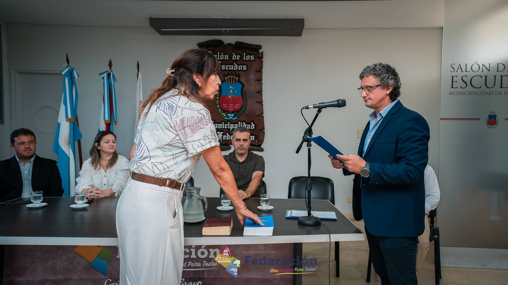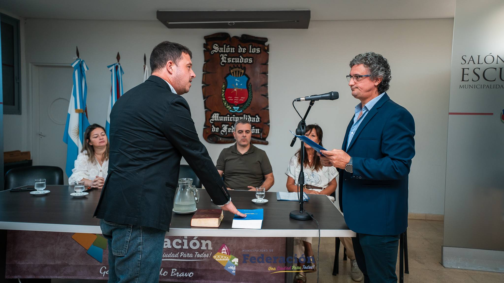 El Presidente Municipal de la ciudad de Federación Ricardo Bravo, en la jornada de este lunes, en el Municipio, encabezó el Acto de Jura y Asunción de los nuevos Secretarios que integrarán su Gabinete. Participaron del acto, la Vice Intendente Silvana Monzón, los integrantes del Gabinete Municipal, Concejales y familiares de los nuevos Secretarios.