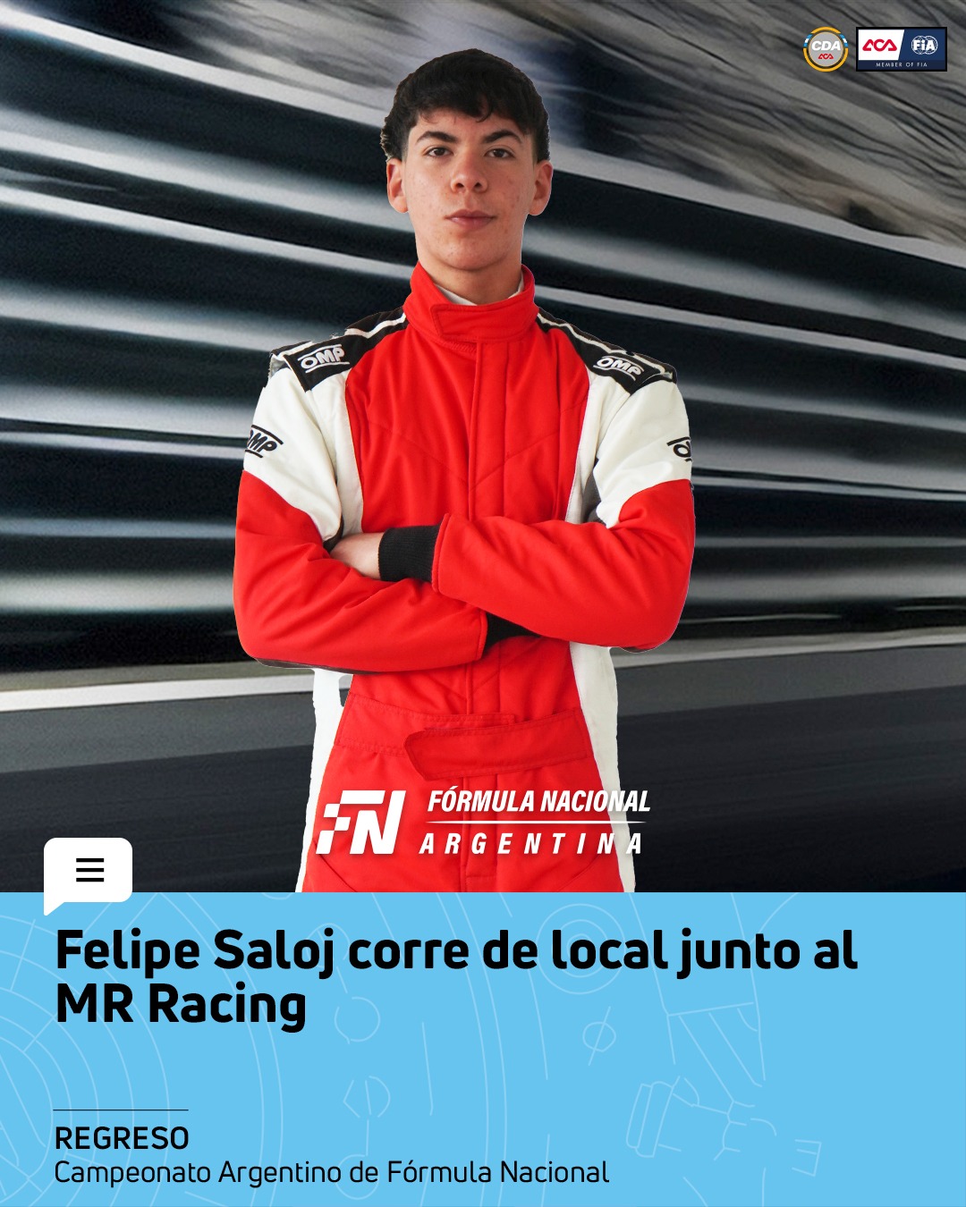 El piloto concordiense Felipe Saloj será protagonista este fin de semana en la segunda fecha del Campeonato Argentino de Fórmula Nacional, que se disputará en el Parque Autódromo Ciudad de Concordia. El joven de 16 años fue confirmado por el equipo MR Racing para competir en el “Gran Premio NEXON”, en el marco de un espectáculo automovilístico que también incluirá al TC2000 y Top Race.