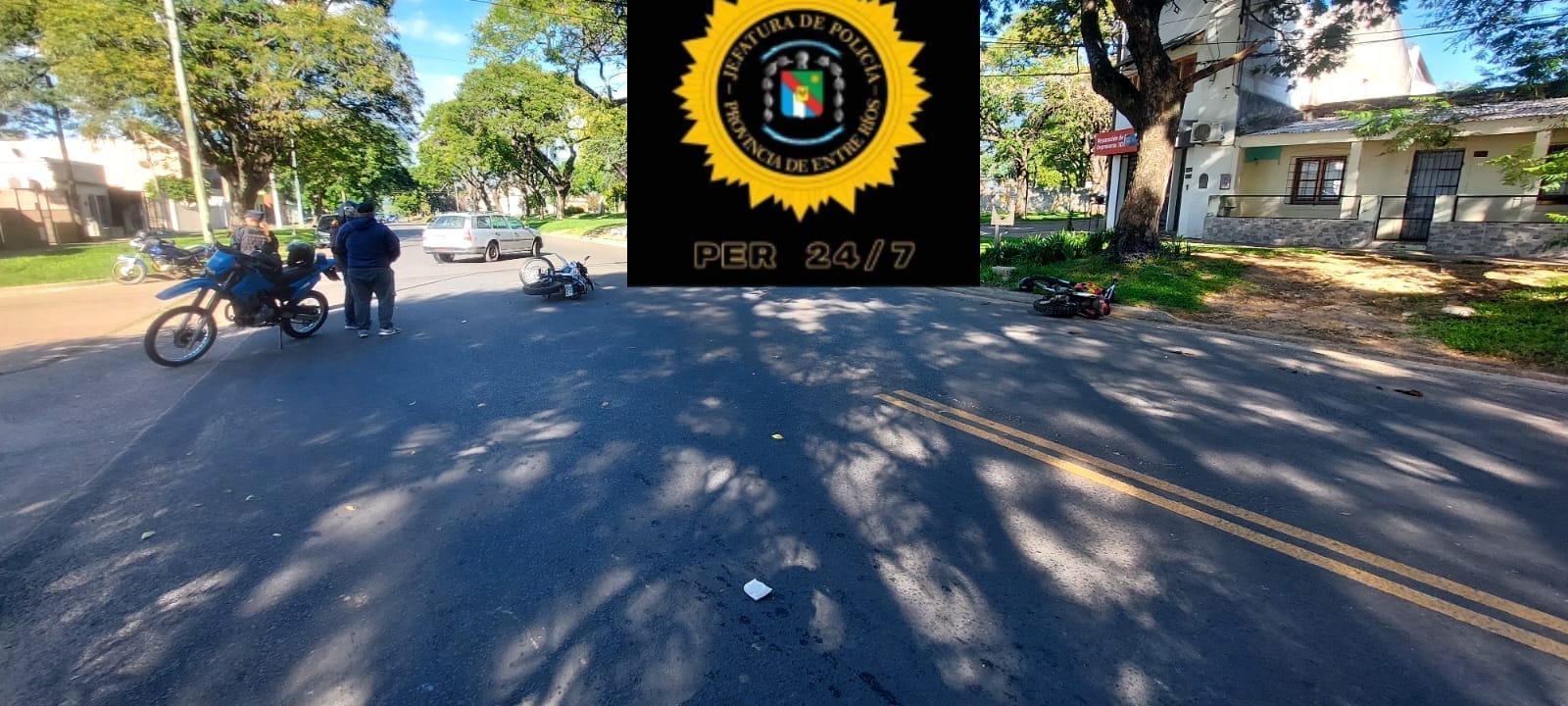 Funcionarios de Comisaría Segunda en horas del mediodía, fueron comisionados a calle Av. H. Primo y Sgto. Cabral debido a un accidente de tránsito. En el punto mencionado se constató una motocicleta marca HONDA-XR 150cc, conducida por un hombre de 38 años y por otro lado, una motocicleta marca HONDA-XR 200cc, conducida por un hombre de 30 años quien iba acompañado por un menor de 8 años, las tres personas involucradas en el accidente tuvieron que ser trasladadas en Ambulancia hacia el Hospital Masvernat para su atención.