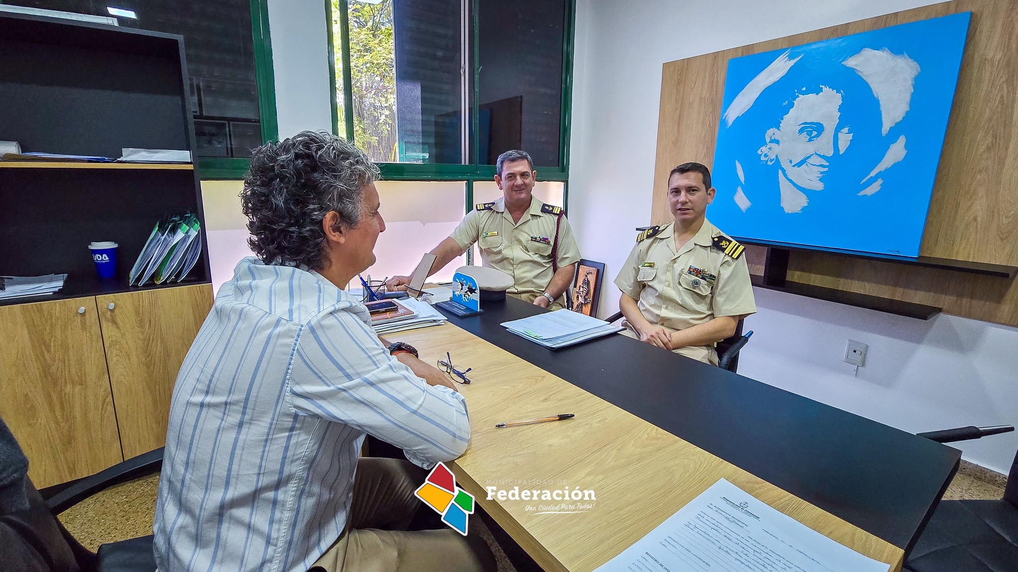El Presidente Municipal de la ciudad de Federación Ricardo Bravo, en la mañana de este lunes, mantuvo un encuentro en su despacho, con el Jefe de la Prefectura local, Prefecto Matías González, quien estuvo acompañado por el Encargado Ayudante de Primera, Marcelo Ríos.