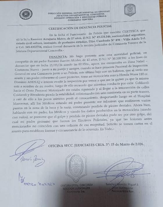 Según consta en la certificación de denuncia policial, el adolescente manifestó que alrededor de las 02:15 horas se encontraba en la zona de Nebél – Costanera Nueva, junto a su pareja y amigos, cuando se hizo presente personal de Inspección General acompañado por un efectivo policial en una camioneta.