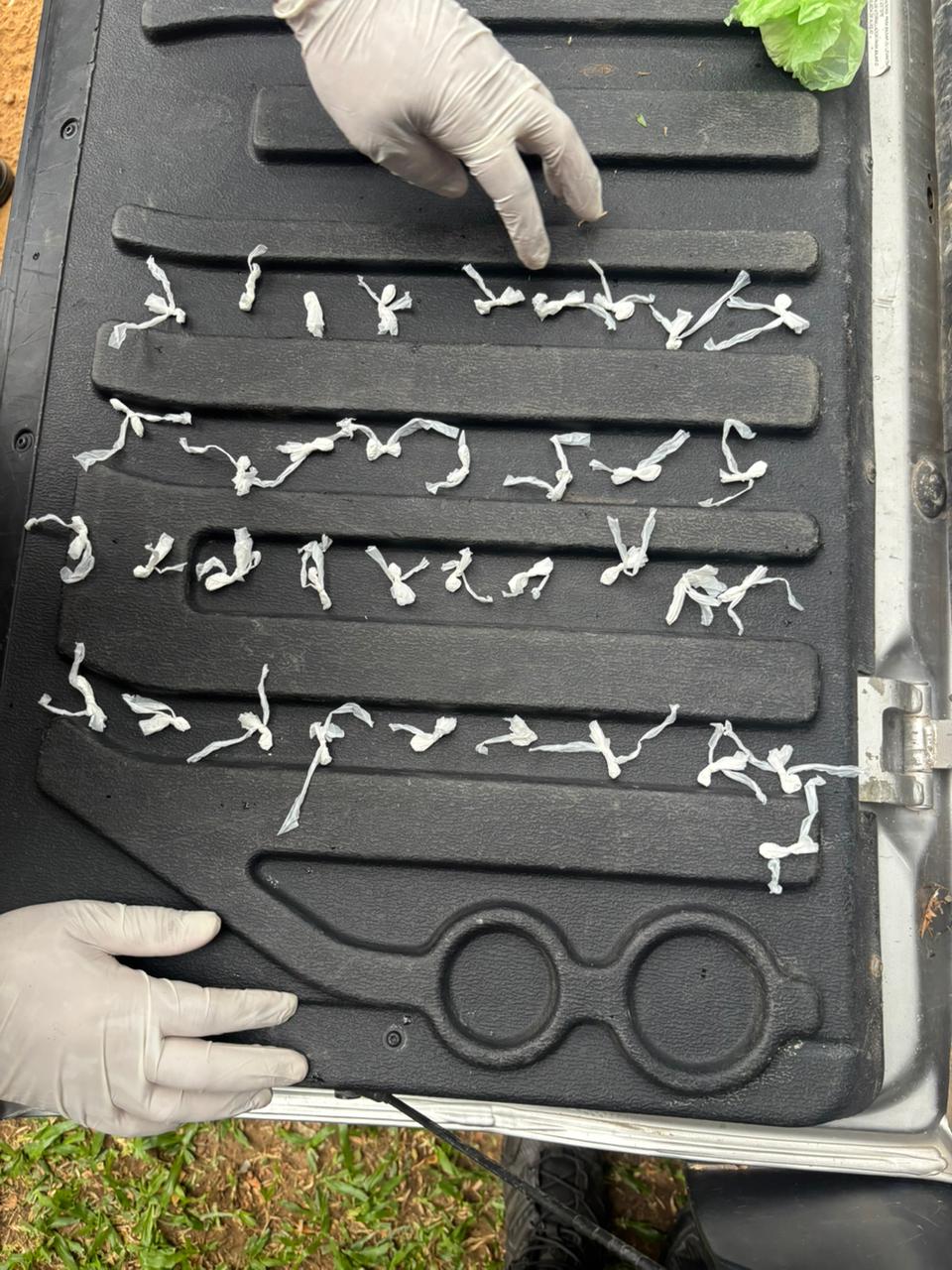 Ante esta situación, los uniformados procedieron a interceptar el rodado e identificar al conductor. Durante el palpado preventivo, el individuo exhibió sus pertenencias, constatándose que llevaba una media que contenía varios envoltorios de nylon.