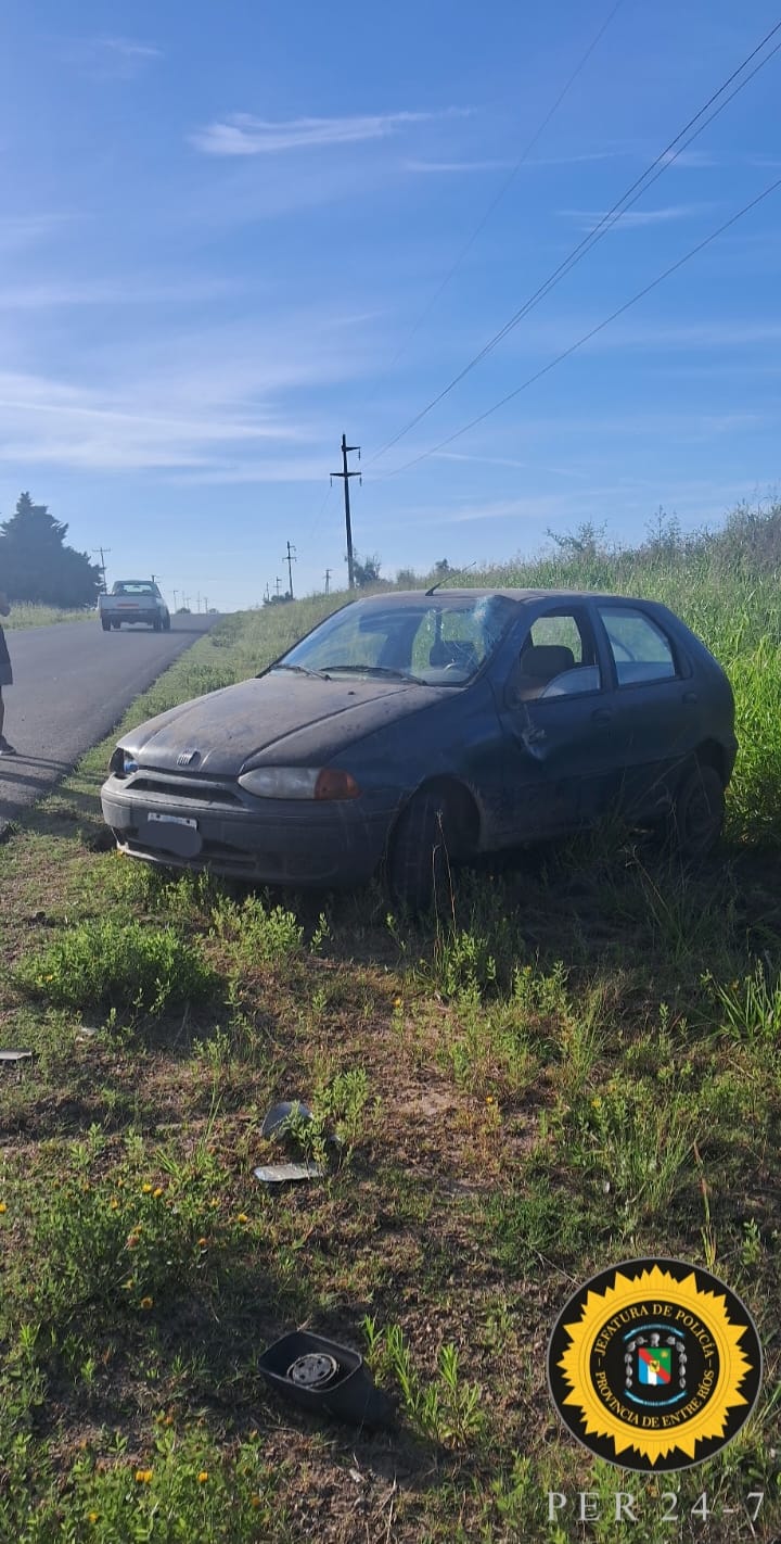Por causas que fueron determinadas en el lugar, un automóvil marca Fiat, modelo Palio, color verde, protagonizó un vuelco luego de sufrir la avería de una de sus ruedas delanteras. El rodado era conducido por una mujer de 48 años, oriunda de la ciudad de (departamento Colón), quien circulaba en sentido San Salvador–Ubajay, acompañada por su hijo mayor de edad.