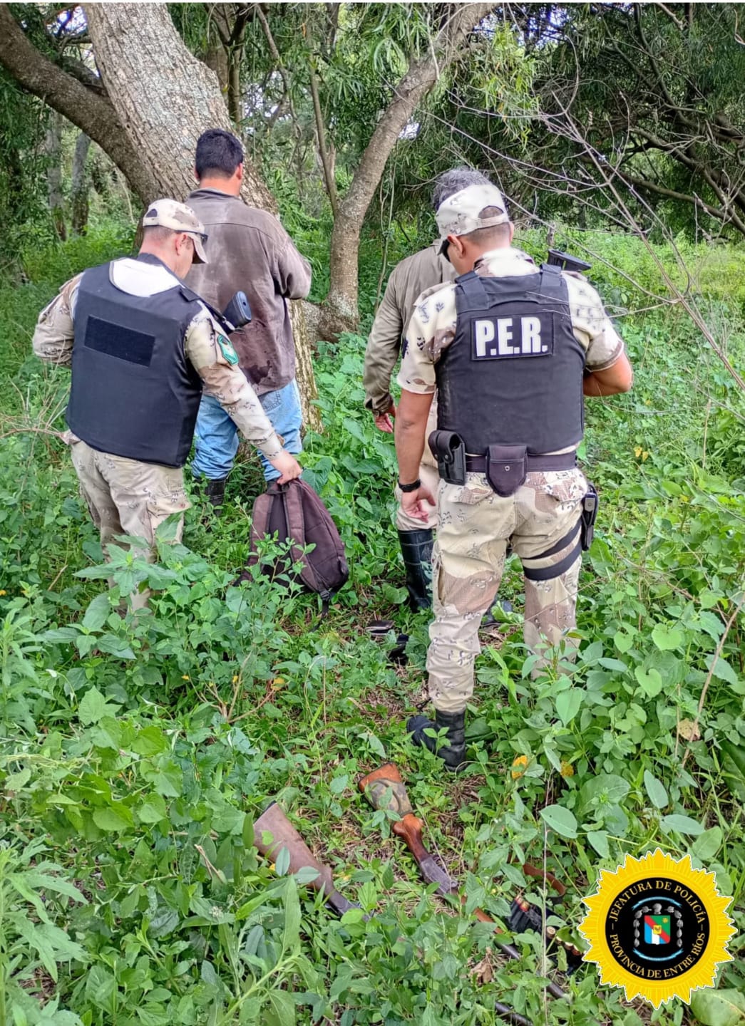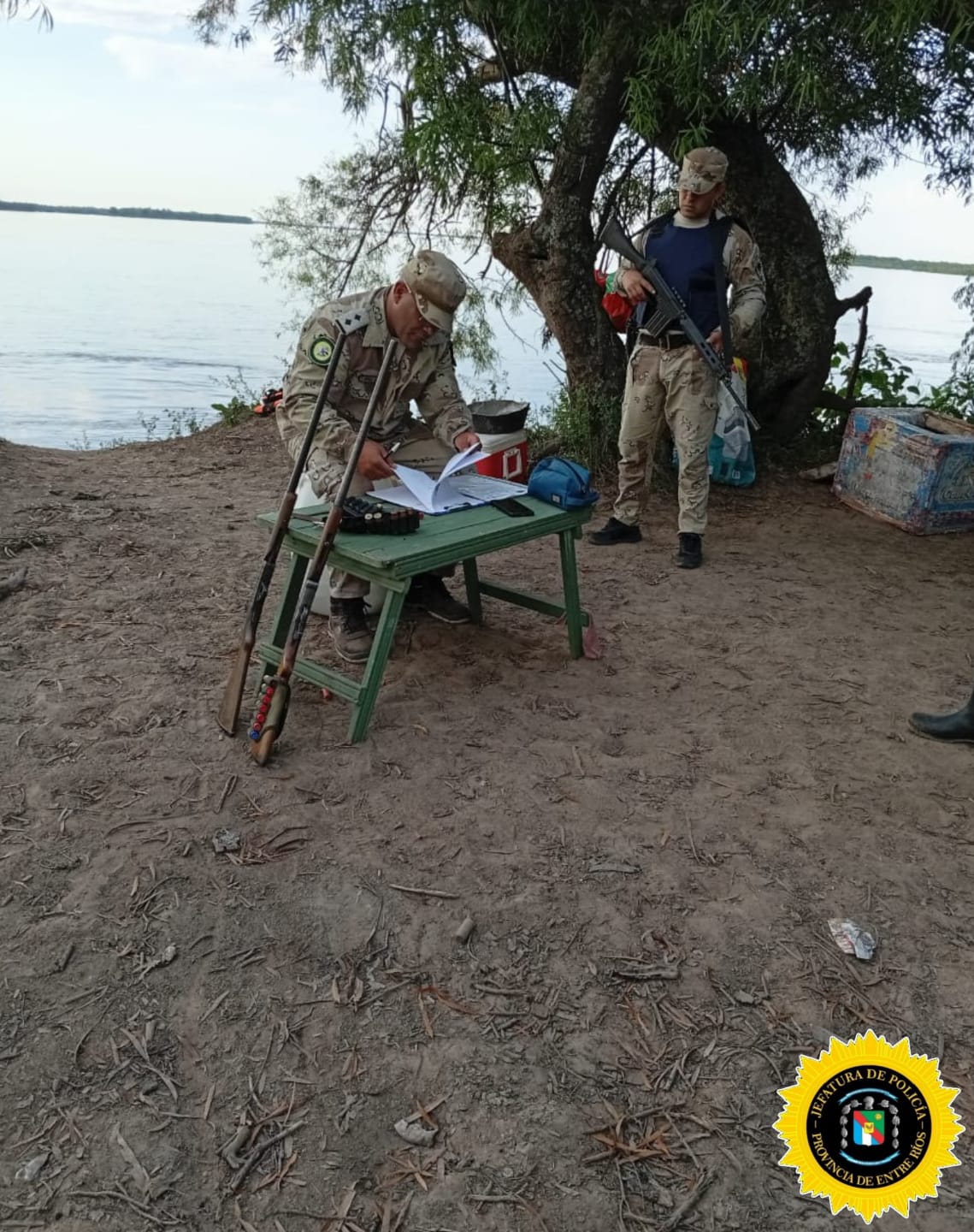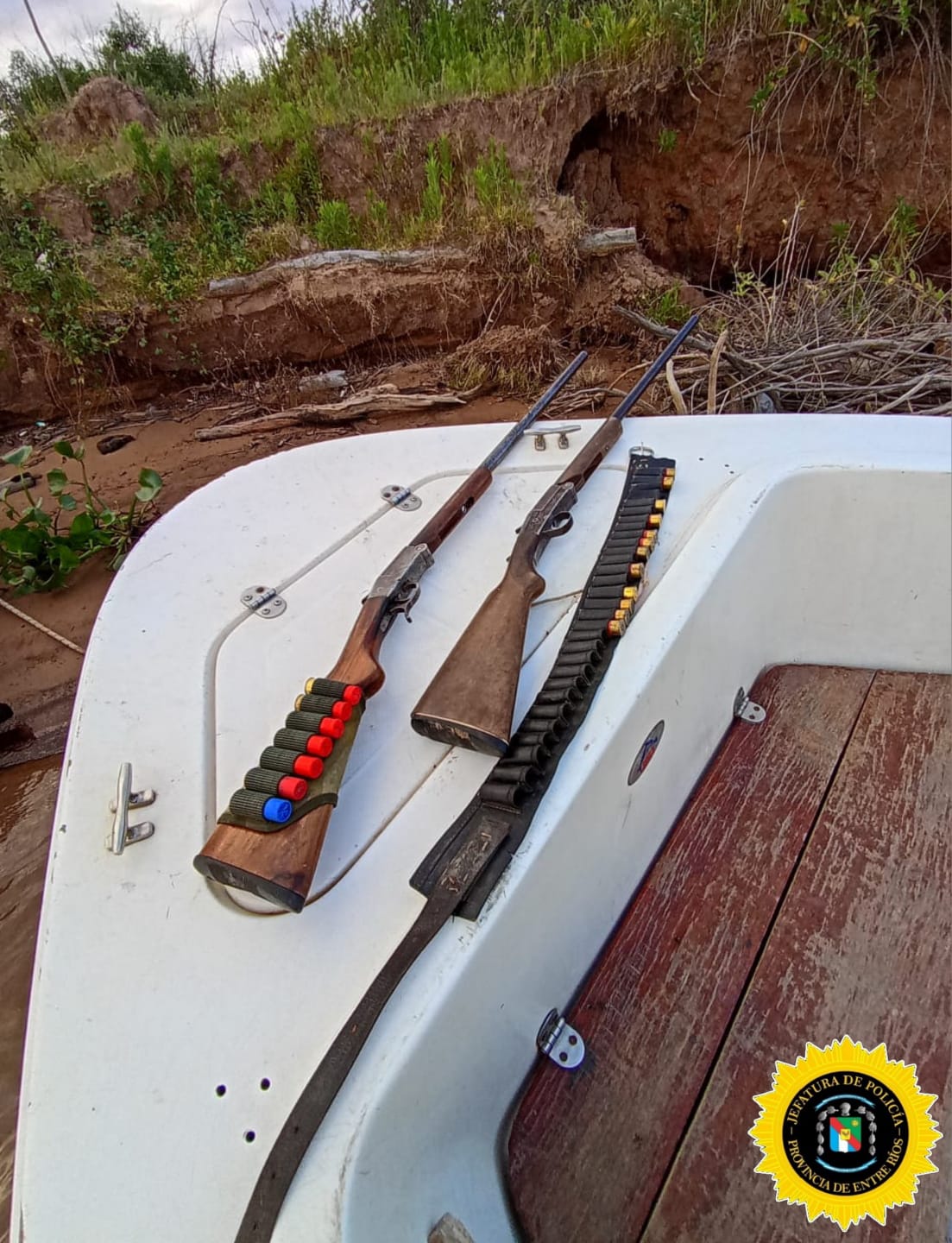 El día Jueves personal policial de esa dependencia que realizaba operativo náutico sobre el Río Paraná, a la altura de la boya 490 frente a Puerto Gaboto de Provincia de Santa Fe, proceden a controlar un campamento temporario sobre una de las islas, pudiendo identificar a dos personas mayores de edad oriundos de Gaboto y Maciel, quienes caminaban adentro de las islas con un carpincho abatido y dos Escopetas calibre 16 y su cartucheria, careciendo estos individuos de todo tipo de documentación requerida por ley, quienes tampoco pudieron acreditar la propiedad de las armas, por cuanto se le dio inmediata intervención a la Unidad Fiscal de la ciudad de Diamante, procediendo al secuestro de las mismas, iniciándose actuaciones policiales de rigor por el Supuesto Delito de Tenencia Ilegal de Arma de Fuego, quedando las personas involucradas supeditadas a la causa, quienes fueron correctamente identificados. Además, paralelamente se inició el expediente contravenciónal por la supuesta infracción a la Ley Provincial de Caza N°4841.