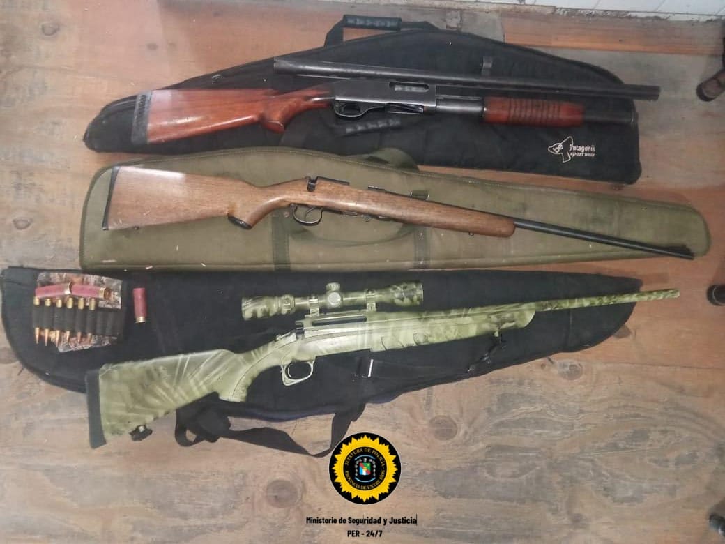 Desde la Fiscalia Auxiliar a cargo de la Dra. Caraballo Denisse, se ordenó el secuestro de la Escopeta y del Fusil por el delito de Tenencia Ilegal de arma de fuego, infraccion al articulo 189 Bis Código Penal Argentino, ya que carecían de la documentación legal exigida por Ley; así mismo se iniciaron actuaciones contravencionales por infraccion a Ley provincial de Caza 4841, secuestrandose una Carabina .22, y el decomiso de las piezas de caza.