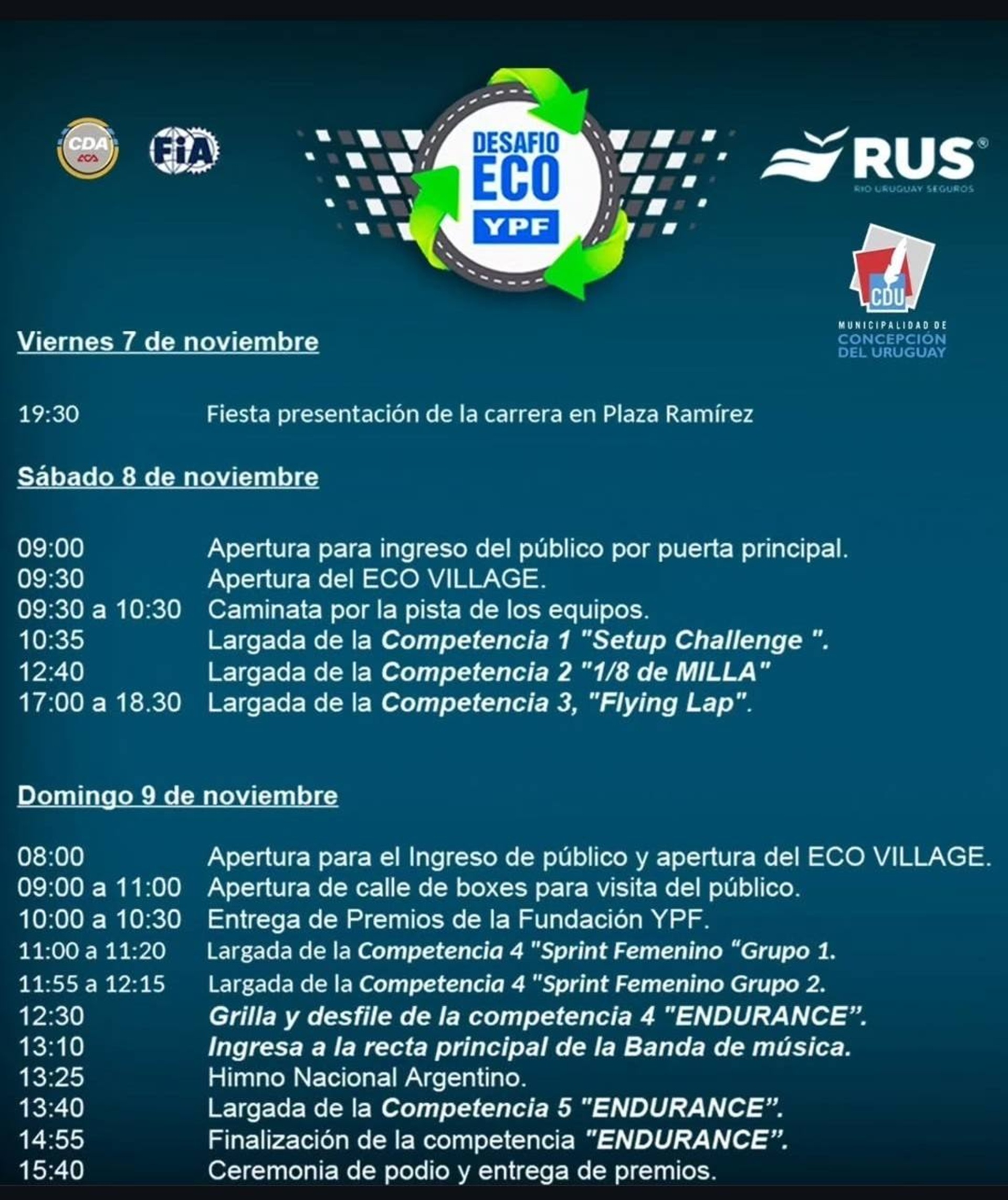Este sábado y domingo siete autos eléctricos construidos por estudiantes y docentes de escuelas técnicas de Entre Ríos competirán en una nueva edición del Desafío Eco YPF, que se desarrollará en el autódromo de Concepción del Uruguay. Las verificaciones técnicas comenzaron este viernes y la competencia se podrá seguir en vivo.
