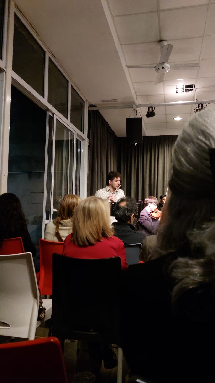 Éramos pocos, es cierto, como suele suceder con muchas propuestas culturales de la ciudad, y al principio eso me molestó. Pensé, una vez más, en todo el esfuerzo que hay detrás de escena: los ensayos, las gestiones, las horas invertidas por cada músico para llegar hasta ese escenario, entre otras que uno nunca se entera. Pero rápidamente cambié la mirada. Lo tomé como lo que terminó siendo: un encuentro íntimo, casi doméstico, donde el arte se vive de cerca, sin distancia ni protocolo, con gusto a hogar.