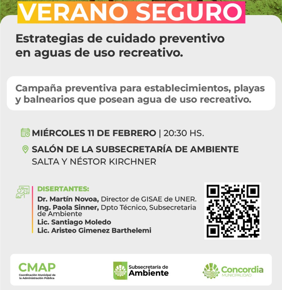 En el marco del Plan de Vigilancia y Monitoreo de la calidad del agua en las playas que lleva adelante la Municipalidad de Concordia, la Subsecretaría de Ambiente realizará este próximo miércoles 11 de febrero una capacitación sobre estrategias preventivas en aguas recreativas.